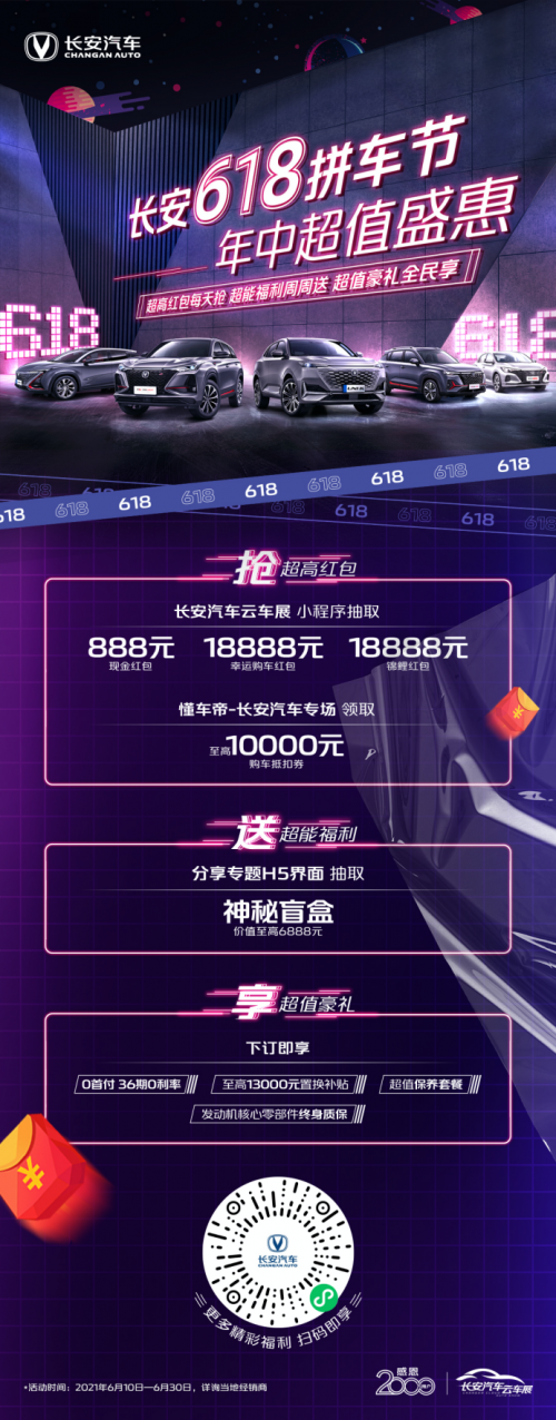 今年的618长安汽车拼车节,为感恩2000万用户的信赖,长安汽车更是优惠多多,福利多多:抢超高红包、送超能福利、享超值豪礼。不仅有888元现金红包、价值6888元神秘盲盒、至高10000元的购车抵扣券、18888元的购车幸运红包、18888元的锦鲤红包,更有至高20000的现金优惠以及超值换购、终身质保等尊贵体验。