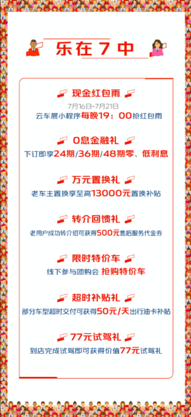 不止低价超值购,在长安汽车7•17购车节期间,不仅结合线下经销店推出多种优惠组合叠加的促销活动,而且在线上线下推出七重豪礼即刻开抢活动,在线上,《长安汽车云车展》小程序推出最新娱乐玩法,消费者只要登录小程序,即可参与活动。豪礼一,七点红包雨,你敢来我就敢给你,每天2500个红包等你来抢,分别在每天的19:00、19:19和19:59三个时间段进行;豪礼二,七种幸运礼,专属福利get你,717元奖品终端兑换不限量,149个1777元和3777元幸运礼等你来抢;豪礼三,七份万元锦鲤,小心重磅大奖砸到你,从7月16日开始,每晚7点抽取1名17777元锦鲤大奖,共7个;豪礼四,万元置换礼,购车就给你优惠到底,新车换购,参与置换活动,最高可享13000元的置换补贴;豪礼五,77元试驾礼,到店就送你,在线下,用户只要到经销店完成试驾即可获得77元试驾礼;豪礼六,现金转介礼,老带新同享“荐面礼”,活动期间,老用户转介绍新用户成功购车后,获赠500元售后代金券;豪礼七,限时特价车,让你秒变一哥,活动期间每天推出1台特价车,限量抢购。七重豪礼,持续放量,敬请“七”待。