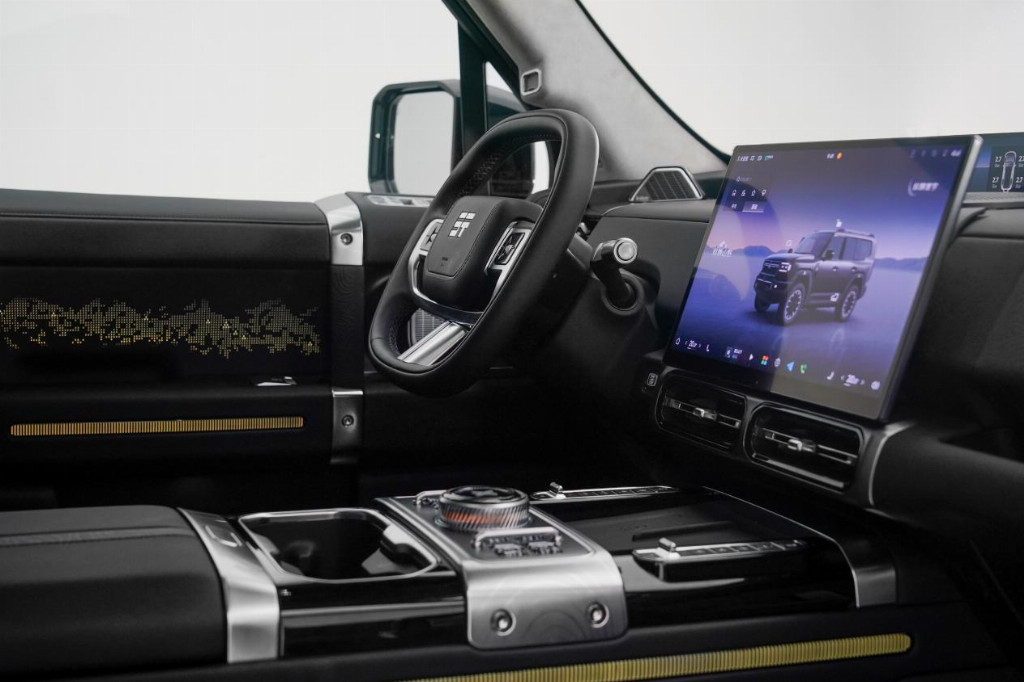 此外,造型上,继承“方盒子”经典造型,延续了短前悬、垂直风挡的经典比例,却以 “冰川塔林”“珠峰图腾” 等东方元素,重构了硬派越野的灵魂。以珠峰北坡冰壁的折角为原型的“陡崖 D 柱型面”,在光影中形成明暗对比,让方正的“方盒子”形态跳出刻板,多了几分自然的韵律。